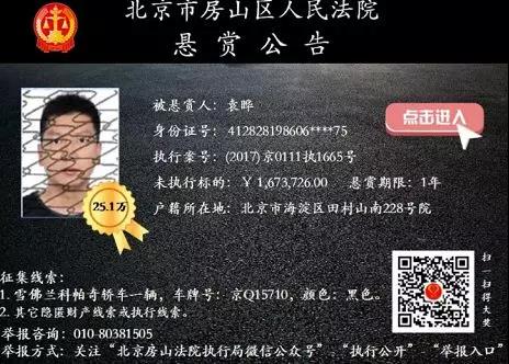 被執(zhí)行人袁曄,33歲,家住北京市海淀區(qū)田村山南228號(hào)院,未履行標(biāo)的額為167萬余元。征集線索為一輛號(hào)牌為京Q15710的黑色雪佛蘭科帕奇轎車及被執(zhí)行人的隱匿財(cái)產(chǎn)線索或執(zhí)行線索。