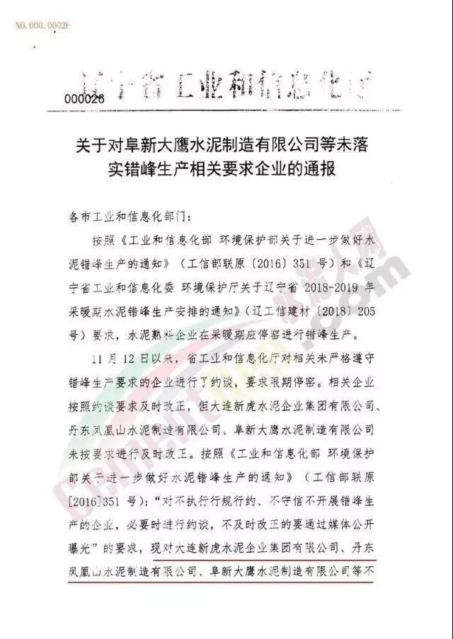 經(jīng)水泥人網(wǎng)曝光后,遼寧省工業(yè)和信息化廳發(fā)布《關(guān)于對(duì)阜新大鷹水泥制造有限公司等未落實(shí)錯(cuò)峰生產(chǎn)相關(guān)要求企業(yè)的通報(bào)》,在經(jīng)過(guò)政府相關(guān)部門約談之后,阜新市大鷹水泥陸續(xù)停產(chǎn)。