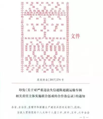 另外,據(jù)水泥人網(wǎng)了解,為了讓整個(gè)運(yùn)輸行業(yè)更加規(guī)范,國(guó)家發(fā)展改革委、中國(guó)人民銀行、交通運(yùn)輸部等36個(gè)部門聯(lián)合簽署的《關(guān)于對(duì)嚴(yán)重違法失信超限超載運(yùn)輸車輛相關(guān)責(zé)任主體實(shí)施聯(lián)合懲戒的合作備忘錄》。