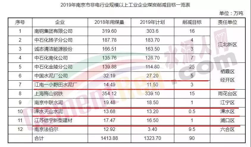 2019年南京市非電行業(yè)規(guī)模以上工業(yè)企業(yè)煤炭削減目標一覽表中所列企業(yè)包括中國水泥廠、江南-小野田、南京中聯(lián)水泥、江蘇信寧新型建材、溧水天山水泥等水泥企業(yè)