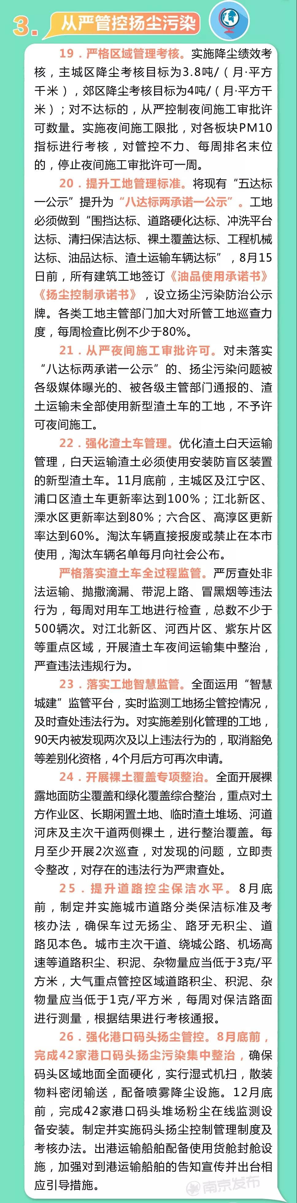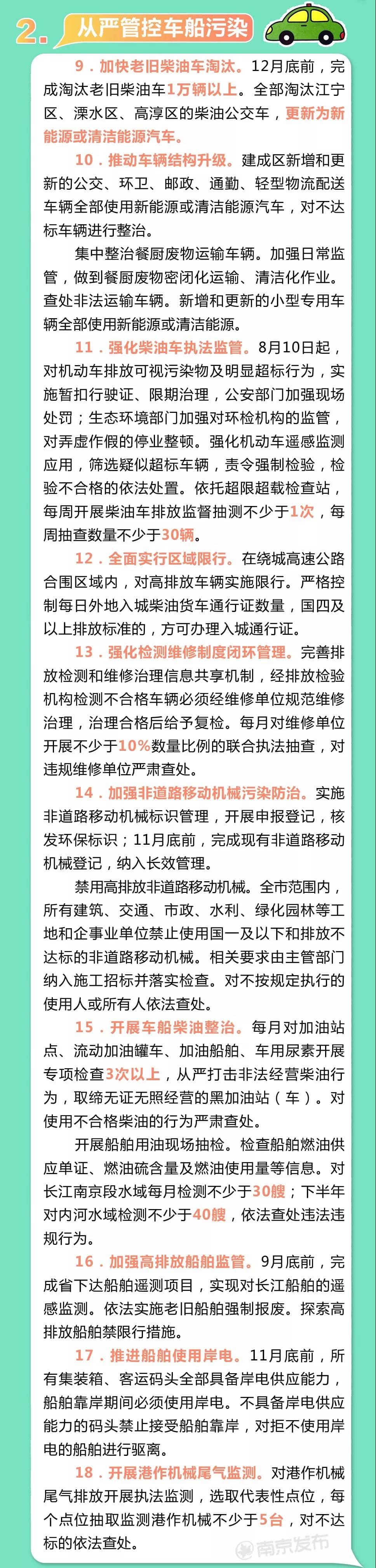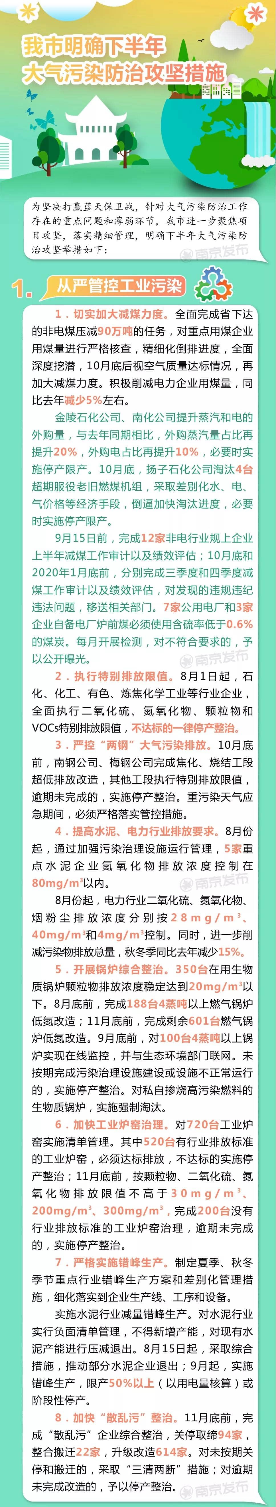 8月9日,南京市出臺《2019年下半年南京市大氣污染防治攻堅措施》堅持“能用盡用、能快則快、能實必實、能嚴盡嚴”的原則,針對工業(yè)污染、車船污染、揚塵污染和臭氧污染4項影響南京空氣質(zhì)量的主要污染源 對癥下藥制定了40條從嚴管控措施 。力爭在本年度剩下的月份提升空氣質(zhì)量讓南京人看到更多藍天。