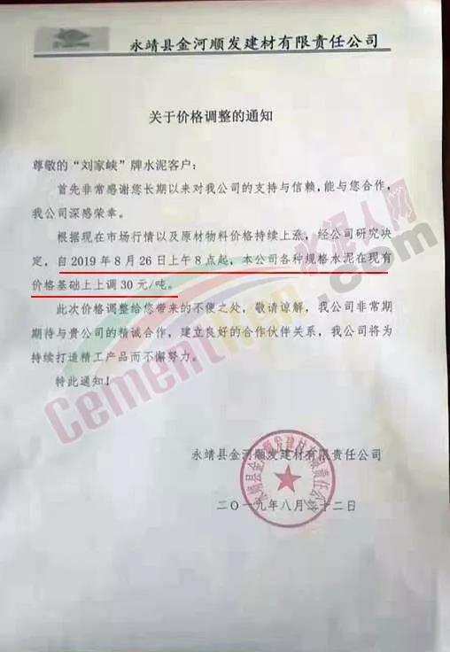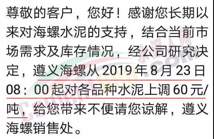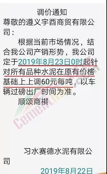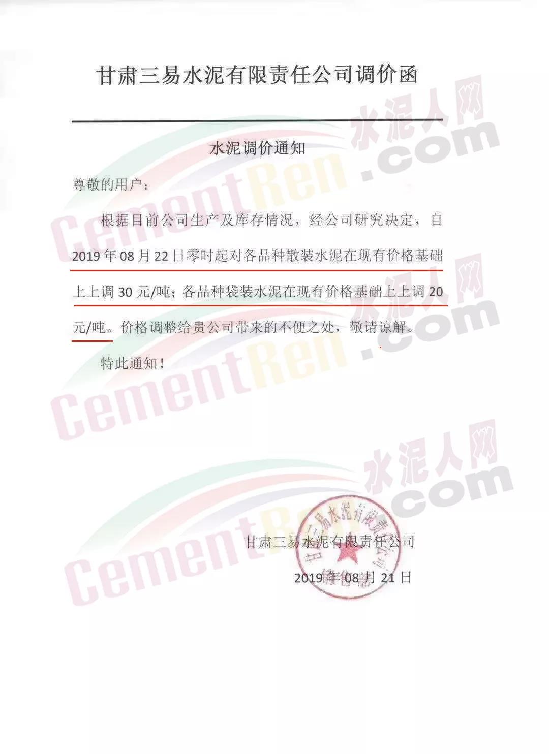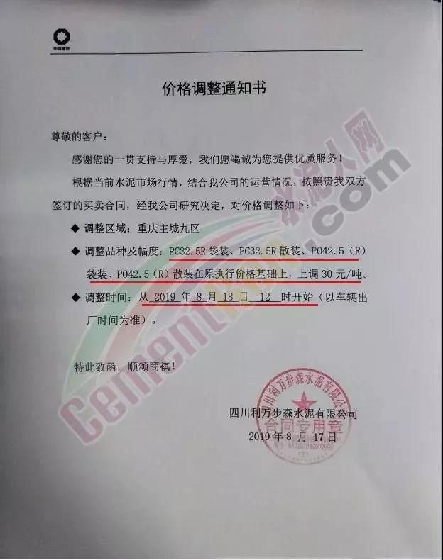 結合當前周邊市場行情,經公司商議決定自2019年8月22日上午9:30分整,32.5水泥袋裝、散裝在原價格基礎上每噸上調10元;42.5水泥袋裝、散裝在原價格基礎上每噸上調10元,特此通知!