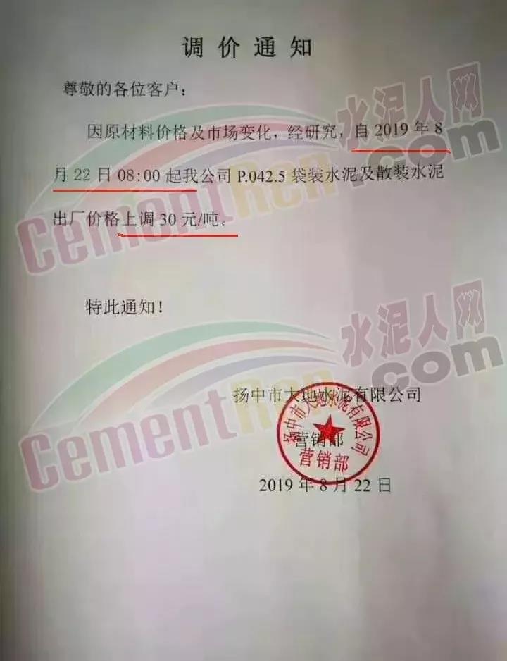 自2019年8月22日上午8時起,阜陽中聯水泥各品種水泥出廠價上調30元/噸。