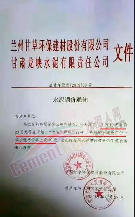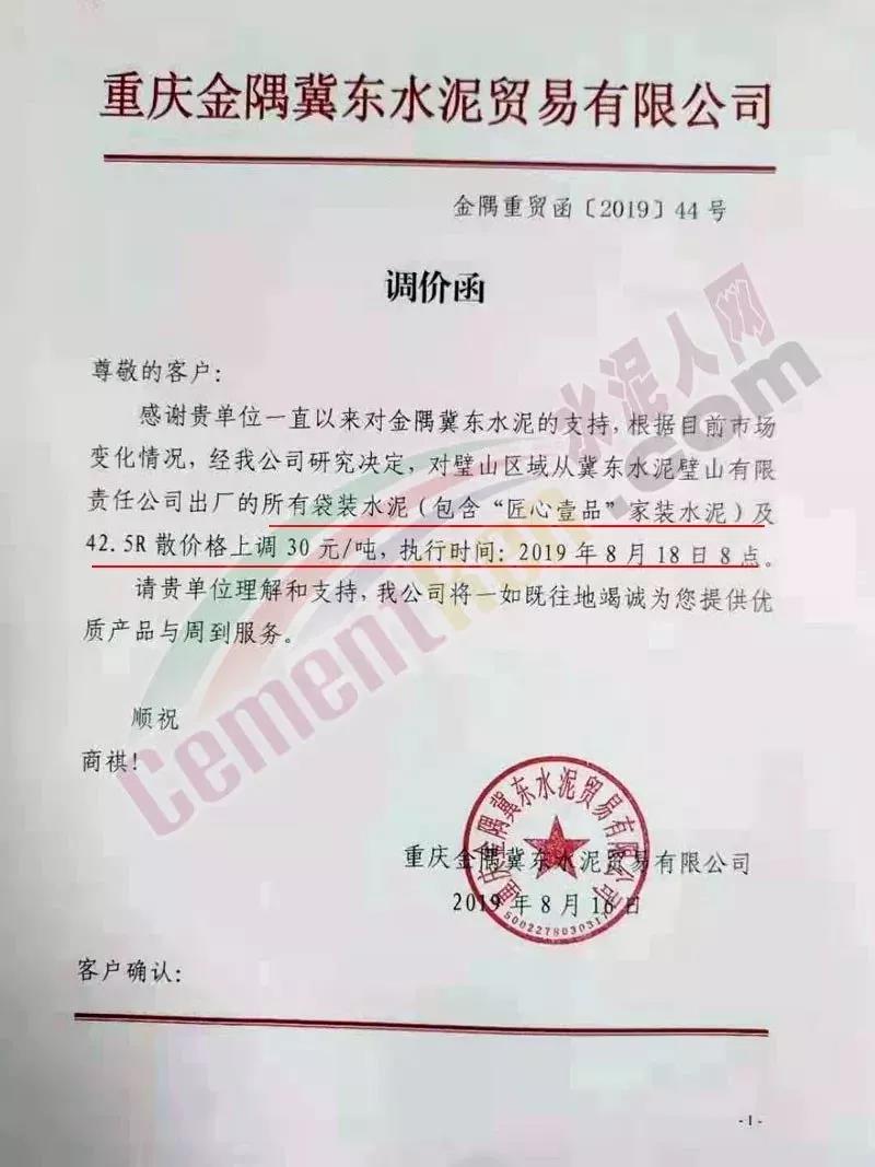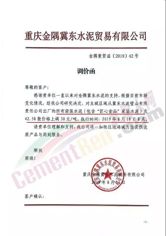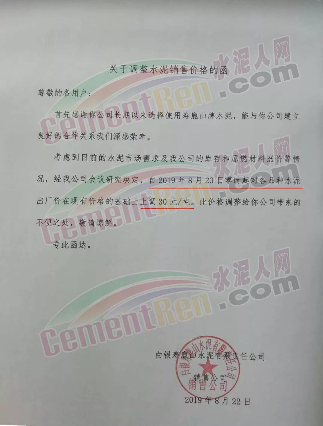 根據當前市場形勢經我公司研究決定,自2019年08月22日上午9:00點起所有水泥品種價格統一上調30元/噸。