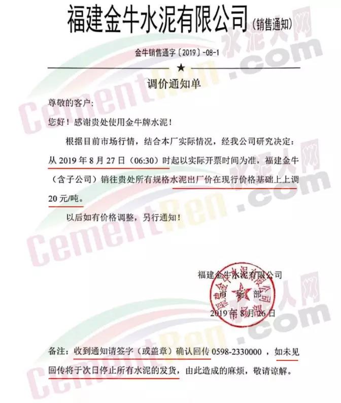 金牛水泥特別強(qiáng)調(diào),收到通知請簽字回傳,如未見回傳將于次日停止所有水泥的發(fā)貨。這是福建金牛水泥8月份的第二次提價,累計(jì)上調(diào)40元/噸。