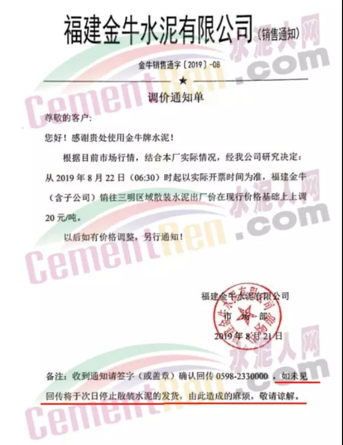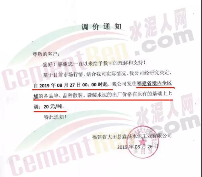 8月26日,福建省大田縣鑫城水泥工業(yè)有限公司發(fā)布調(diào)價通知稱:基于目前市場行情,結(jié)合我司實(shí)際情況,我公司經(jīng)研究決定,自2019年8月27日00:00時起,我公司發(fā)往福建省境全區(qū)域的各品牌、品牌散裝、袋裝水泥的出廠價格在原有的基礎(chǔ)上上調(diào)20元/噸。