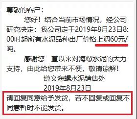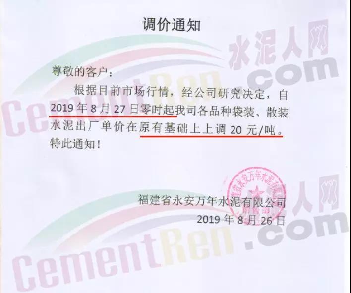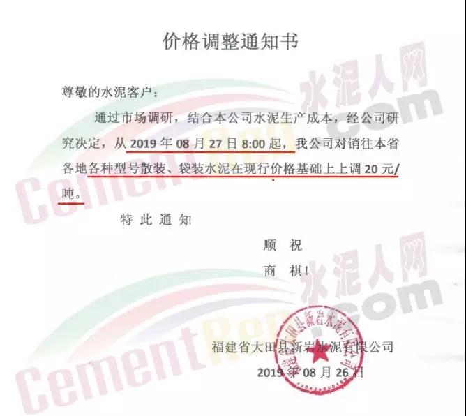 8月26日,福建省大田縣新巖水泥有限公司發(fā)布價格調(diào)通知稱:通過市場調(diào)研,結(jié)合本公司水泥生產(chǎn)成本,經(jīng)公司研究決定,從2019年8月27日8:00起,我公司對銷往本省各地各種型號散裝、袋裝水泥在再行價格基礎(chǔ)上上調(diào)20元/噸。