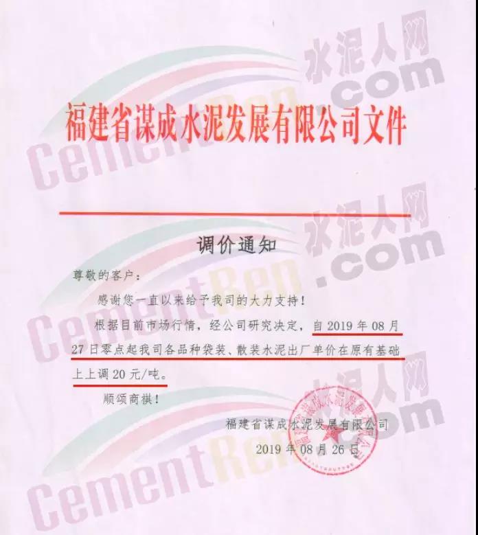 8月26日。福建省謀成水泥發(fā)展有限公司發(fā)布調(diào)價通知稱:根據(jù)目前市場行情,經(jīng)公司研究決定,自2019年8月27日零時起,我司各品種袋裝、散裝水泥出廠單價在原有基礎(chǔ)上上調(diào)20元/噸,本次調(diào)價為謀成水泥8月份的第二調(diào)價,累計(jì)上調(diào)40元/噸。