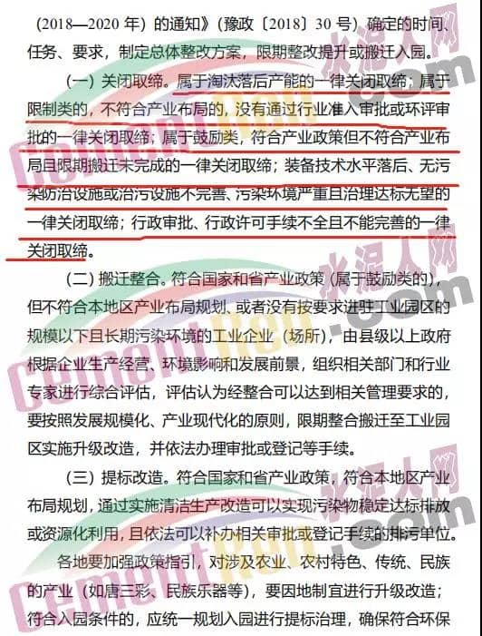 (一)關(guān)閉取締。屬于淘汰落后產(chǎn)能的一律關(guān)閉取締;屬于限制類的,不符合產(chǎn)業(yè)布局的,沒有通過行業(yè)準入審批或環(huán)評審批的一律關(guān)閉取締;屬于鼓勵類,符合產(chǎn)業(yè)政策但不符合產(chǎn)業(yè)布 局且限期搬遷未完成的一律關(guān)閉取締;裝備技術(shù)水平落后、無污 染防治設(shè)施或治污設(shè)施不完善、污染環(huán)境嚴重且治理達標無望的 一律關(guān)閉取締;行政審批、行政許可手續(xù)不全且不能完善的一律關(guān)閉取締。