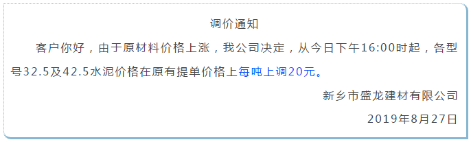 鄭州某水泥企業(yè)負(fù)責(zé)介紹,鄭州地區(qū)水泥企業(yè)將于9月初開(kāi)始停產(chǎn),整個(gè)9月份都將處于停產(chǎn)狀態(tài),水泥價(jià)格也將會(huì)有所上漲,目前局部地區(qū)的水泥企業(yè)已經(jīng)開(kāi)始漲價(jià)了。