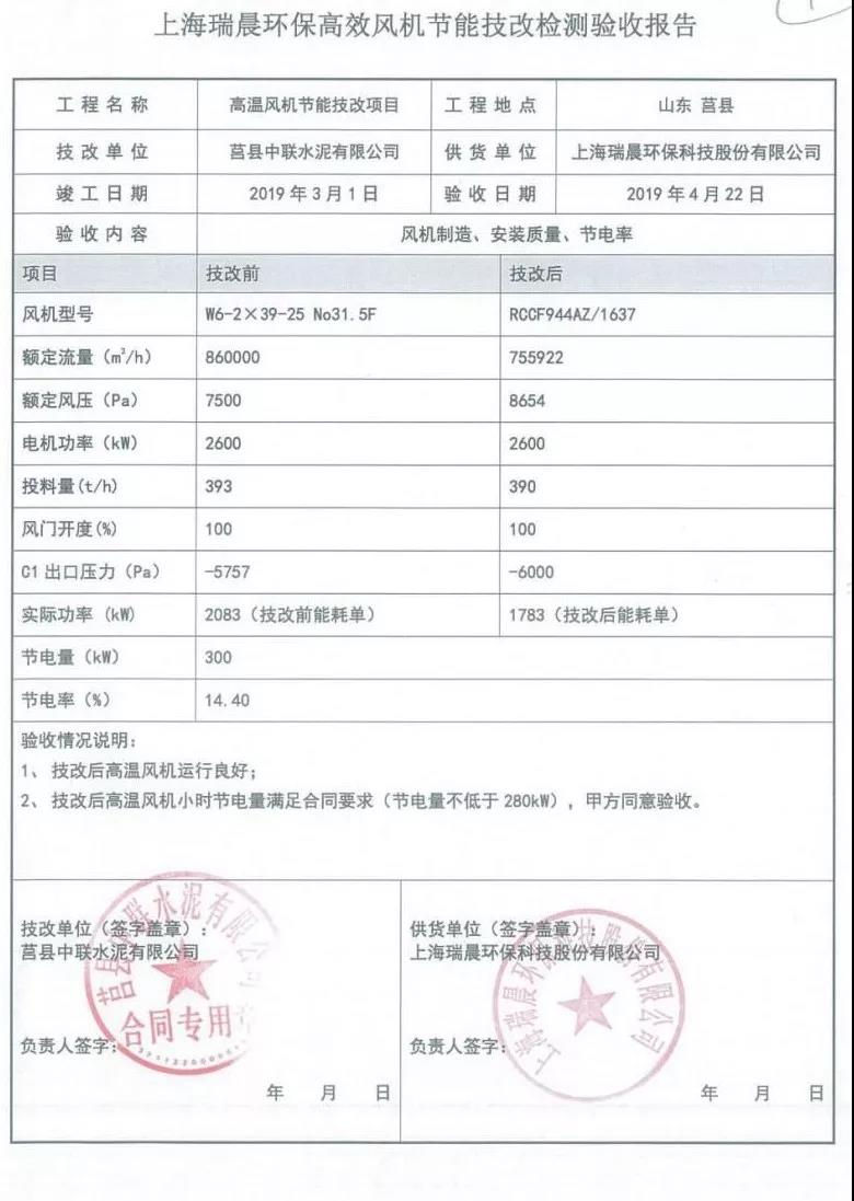 由于循環(huán)風(fēng)機(jī)改造的成功,2018年底,莒縣中聯(lián)果斷選擇將其高溫風(fēng)機(jī)交由上海瑞晨改造,有了前一次的雙方成功磨合經(jīng)驗(yàn),改造升級(jí)工程僅于2019年3月份便安裝完成。在同等工況下對(duì)比,每小時(shí)節(jié)電量達(dá)到300kWh。超出改造技術(shù)協(xié)議要求(技術(shù)協(xié)議要求280kWh),項(xiàng)目于2019年4月順利完成驗(yàn)收。