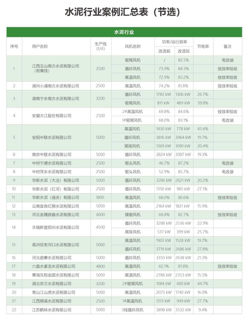 據(jù)瑞晨陳總介紹,公司高效風(fēng)機(jī)廣受行業(yè)歡迎,目前已經(jīng)在中建材(南方水泥、中聯(lián)水泥、中材水泥)、華新、葛洲壩、天瑞、金隅等多家水泥企業(yè)集團(tuán)有穩(wěn)定運(yùn)行業(yè)績(jī),超過(guò)300余臺(tái)窯頭窯尾、高溫、循環(huán)、除塵風(fēng)機(jī)等在生產(chǎn)線服役,均為業(yè)主方帶來(lái)了可觀回報(bào),以下摘選部分案例展示: