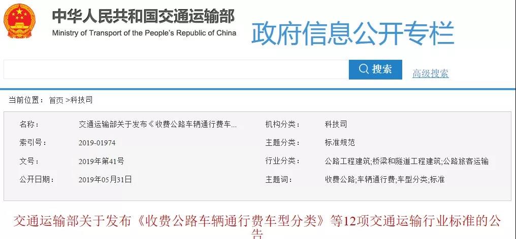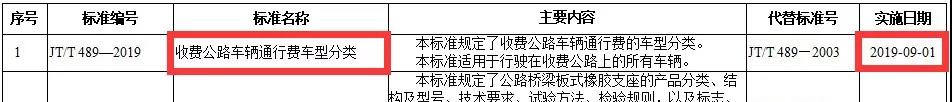 關(guān)于《收費(fèi)公路車輛通行費(fèi)車型分類》行業(yè)標(biāo)準(zhǔn)的實(shí)施時(shí)間方面,交通運(yùn)輸部文件附件明確實(shí)施日期:2019年9月1日。
