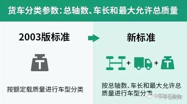 2003版標(biāo)準(zhǔn)中,貨車按照車輛出廠后國家有關(guān)行政主管部門核定的額定載質(zhì)量進(jìn)行車型分類,新標(biāo)準(zhǔn)中各類貨車均按照總軸數(shù)、車長和最大允許總質(zhì)量進(jìn)行車型分類。