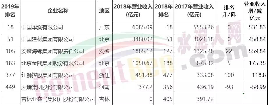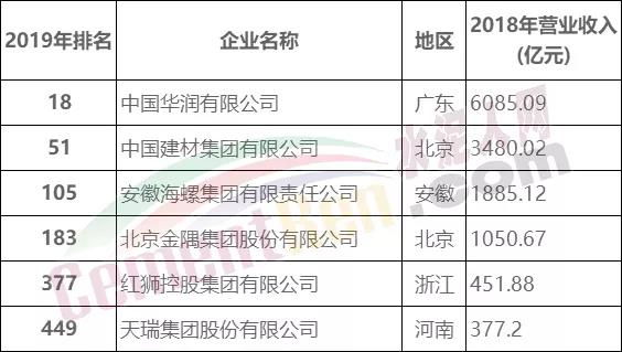 水泥行業(yè)的中國華潤有限公司、中國建材集團(tuán)有限公司、安徽海螺集團(tuán)有限責(zé)任公司、北京金隅集團(tuán)股份有限公司、紅獅控股集團(tuán)有限公司、天瑞集團(tuán)股份有限公司等多家企業(yè)榜上有名。上述六家企業(yè)2018年營業(yè)收入合計13329.98億元。占500強榜單總營業(yè)收入的791000億元的1.69%。