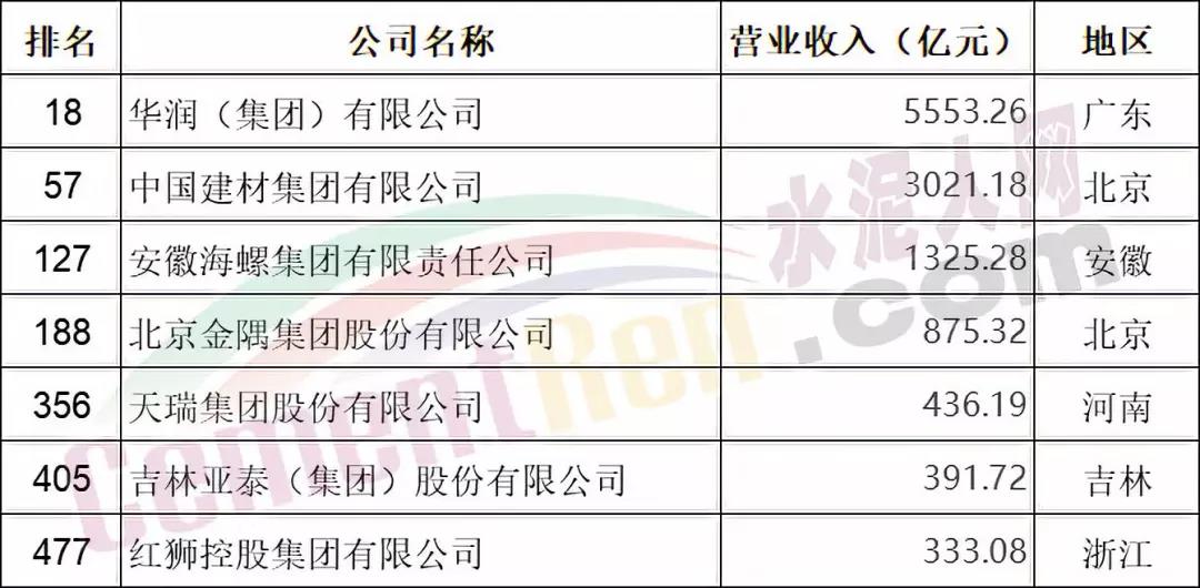 其中水泥行業(yè)華潤(集團(tuán))有限公司、中國建材集團(tuán)有限公司、安徽海螺集團(tuán)有限責(zé)任公司、北京金隅集團(tuán)股份有限公司、天瑞集團(tuán)股份有限公司、吉林亞泰(集團(tuán))股份有限公司、紅獅控股集團(tuán)有限公司等多家企業(yè)上榜。