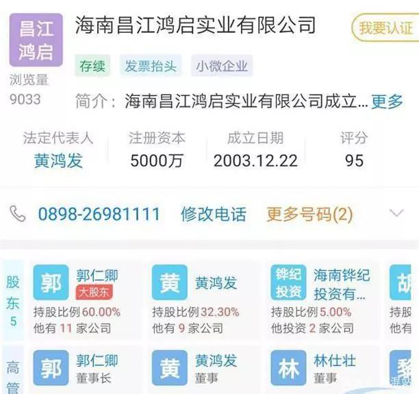 天眼查信息表現(xiàn),海南昌江鴻啟實(shí)業(yè)有限公司注冊(cè)資本為5000萬元,黃鴻發(fā)持股32.3%,為公司董事、法定代表人;而公司第一大股東、董事等人均在警方列出的黃鴻發(fā)案涉案犯法嫌疑人名單傍邊。