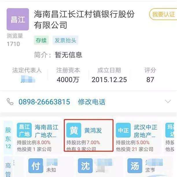 就金融業(yè)來看,鴻啟實(shí)業(yè)系海南鴻發(fā)典當(dāng)有限公司持股50%的控股股東,黃鴻發(fā)為董事長、法定代表人;別的,黃鴻發(fā)小我還持有海南昌江長江村鎮(zhèn)銀行7%的股份。