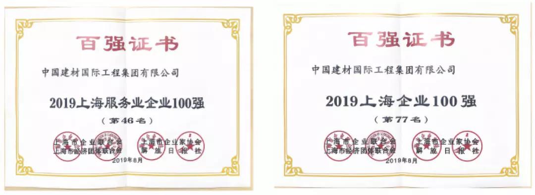 中國(guó)建材工程榮獲2019“上海企業(yè)100強(qiáng)”及“上海服務(wù)業(yè)企業(yè)100強(qiáng)”稱號(hào)