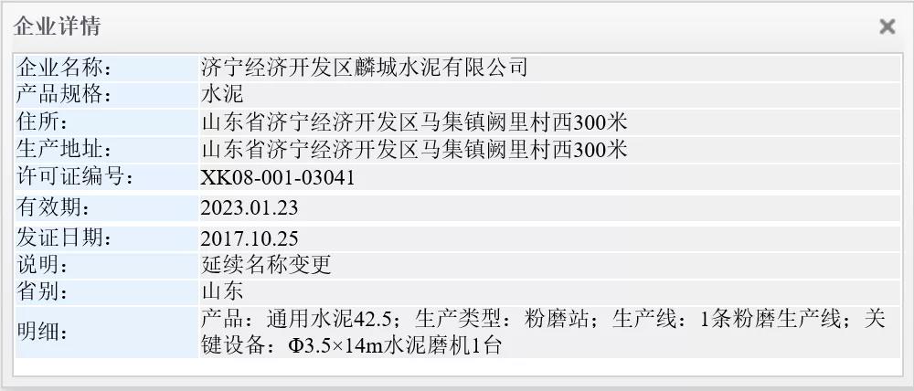 市場監(jiān)管總局生產(chǎn)許可證辦公室數(shù)據(jù)顯示,濟(jì)寧經(jīng)濟(jì)開發(fā)區(qū)麟城水泥有限公司生產(chǎn)地址位于山東省濟(jì)寧經(jīng)濟(jì)開發(fā)區(qū)馬集鎮(zhèn)闕里村西300米。企業(yè)擁有一條水泥粉磨生產(chǎn)線,其關(guān)鍵設(shè)備為Φ3.5×14m水泥磨機(jī)1臺。