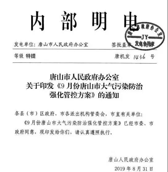 唐山市人民政府發(fā)布關(guān)于《9月份唐山市大氣污染防治強(qiáng)化管控方案》要求的管控時(shí)間是自2019年9月28日至10月4日。要求水全市水泥熟料生產(chǎn)企業(yè)停產(chǎn),承擔(dān)處置污泥和生活垃圾的企業(yè)按照實(shí)際處置量保持最低負(fù)荷生產(chǎn)。允許生產(chǎn)的水泥企業(yè)必須執(zhí)行超低排放。