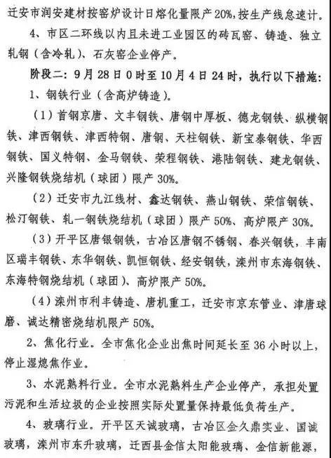 同期,唐山市相關(guān)部門發(fā)布通知稱根據(jù)氣象部門預(yù)測(cè),9月2日20時(shí)至7日12時(shí)唐山市以偏東風(fēng)為主,風(fēng)力偏弱,夜間伴有5-6℃逆溫,整體擴(kuò)散條件差。為降低污染傳輸影響,在嚴(yán)格落實(shí)9月份強(qiáng)化管控措施基礎(chǔ)上,9月2日18時(shí)至7日12時(shí)期間,執(zhí)行管控措。要求水泥行業(yè)企業(yè)一條水泥窯企業(yè)限產(chǎn)40%;兩條及以上水泥窯企業(yè)停一條水泥窯生產(chǎn)線。