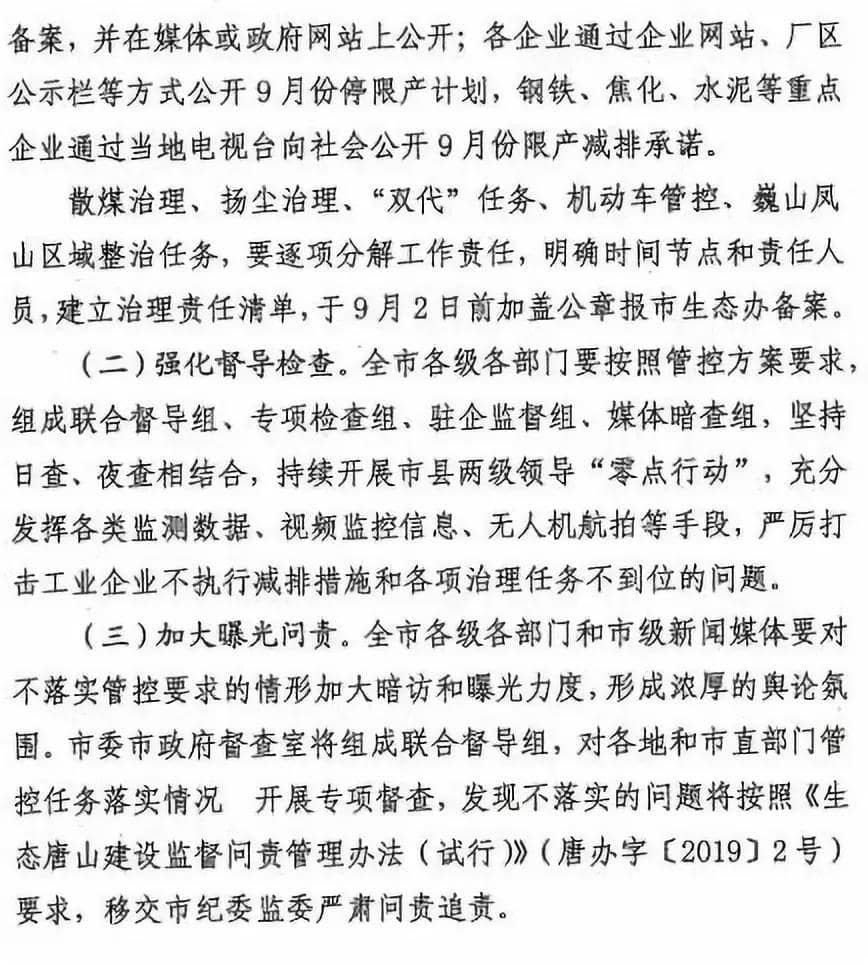 運(yùn)輸物流方面要求全市鋼鐵、焦化、水泥等人后果按照核定的生產(chǎn)負(fù)荷相應(yīng)調(diào)整錯(cuò)峰運(yùn)輸方案,并報(bào)市交運(yùn)局監(jiān)督執(zhí)行。