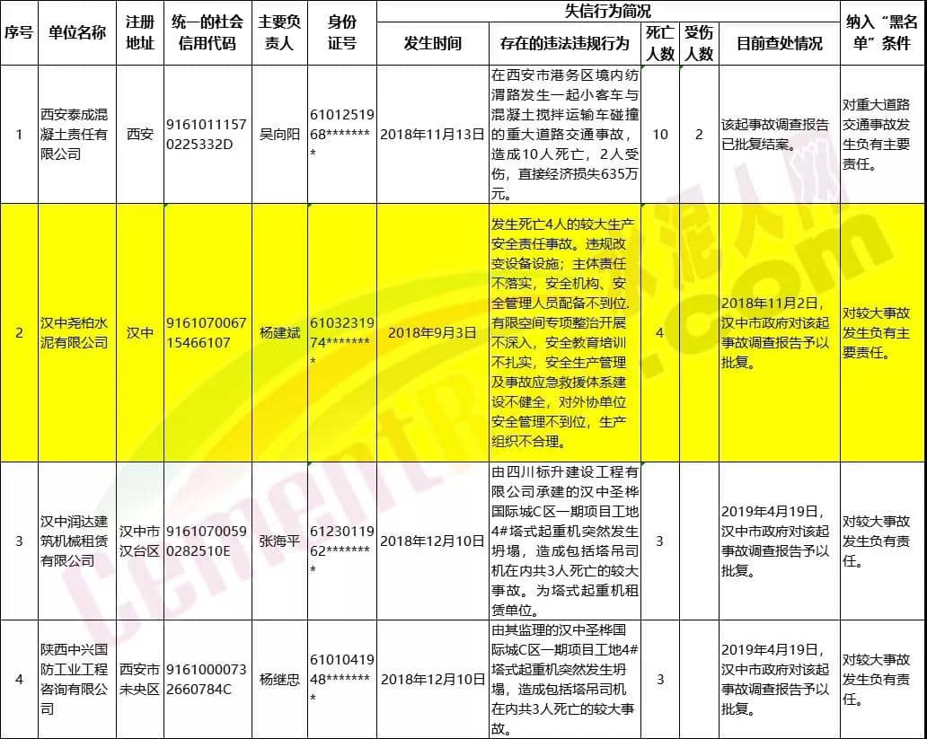 公示附表列出了上述四家企業(yè)納入“黑名單”的失信行業(yè)情況,納入“黑名單”的條件。其中漢中堯柏水泥有限公司2018年9月3日發(fā)生死亡4人的較大生產(chǎn)安全責(zé)任事故。違規(guī)改變?cè)O(shè)備設(shè)施;主體責(zé)任不落實(shí),安全機(jī)構(gòu)、安全管理人員配備不到位.有限空間專項(xiàng)整治開(kāi)展不深入,安全教育培訓(xùn)不扎實(shí),安全生產(chǎn)管理及事故應(yīng)急救援體系建設(shè)不健全,對(duì)外協(xié)單位安全管理不到位,生產(chǎn)組織不合理。2018年11月2日,漢中市政府對(duì)該起事故調(diào)查報(bào)告予以批復(fù)。對(duì)較大事故發(fā)生負(fù)有主要責(zé)任為其納入“黑名單”的條件。