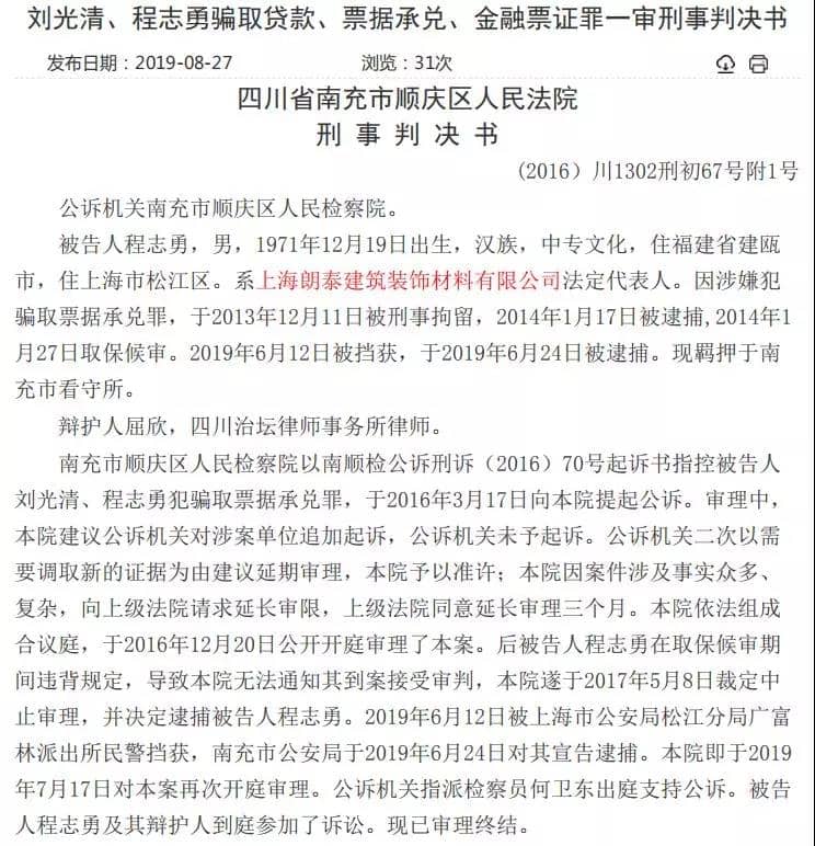 隨后南充市公安局以劉某清、程某勇等人涉嫌犯騙取票據(jù)承兌罪立案。判決書顯示,至2016年12月20日,郎泰公司尚欠本金185.36萬(wàn)元,但程某勇的多出資產(chǎn)已被查封。