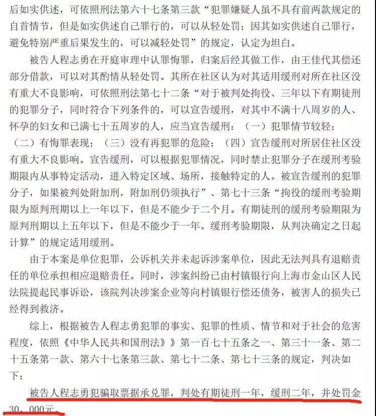 最終,南充市順慶區(qū)人民法院判處程某勇犯騙取票據(jù)承兌罪,判處其有期徒刑1年,緩刑2年,并處罰金3萬(wàn)元。