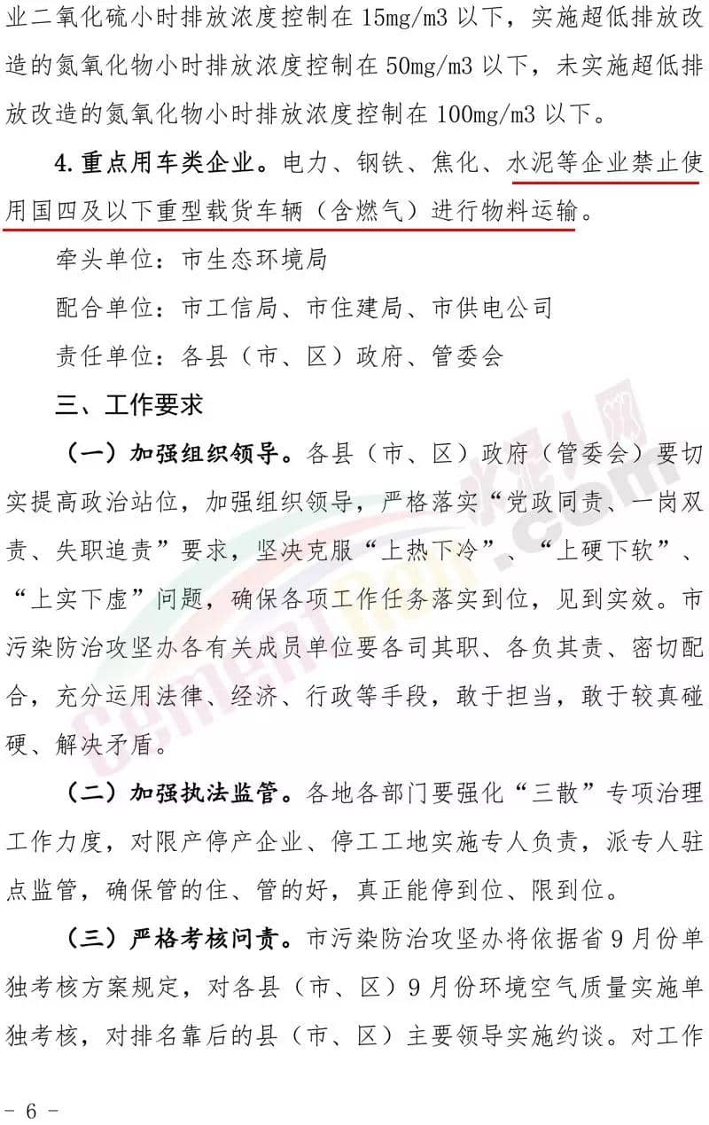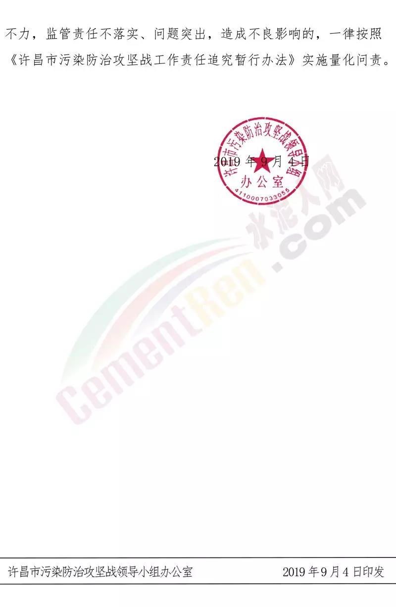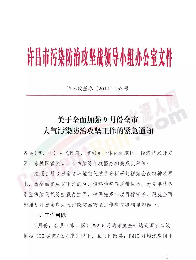 水泥人網(wǎng)消息:日前,許昌市污染防治攻堅戰(zhàn)領(lǐng)導(dǎo)小組辦公室發(fā)布《關(guān)于全面加強9月份全市大氣污染防治攻堅工作的緊急通知》稱按照9月3全省環(huán)境空氣質(zhì)量分析研判視頻會議精神及要求,為全面完成河南省下達的9月份環(huán)境空氣質(zhì)量目標(biāo),為今年秋冬季重污染天氣防控贏得空間,確保完成年度目標(biāo)任務(wù),就全面加強9月份全市大氣污染防治攻堅工作有關(guān)事項中包括強力實施工業(yè)減排,9月5日~16日期間,各縣(市、區(qū))工業(yè)企業(yè)顆粒物、二氧化硫、氮氧化物和揮發(fā)性有機物減排比例分別達到全社會排放總量20%以上。具體招待以下管控要求為: