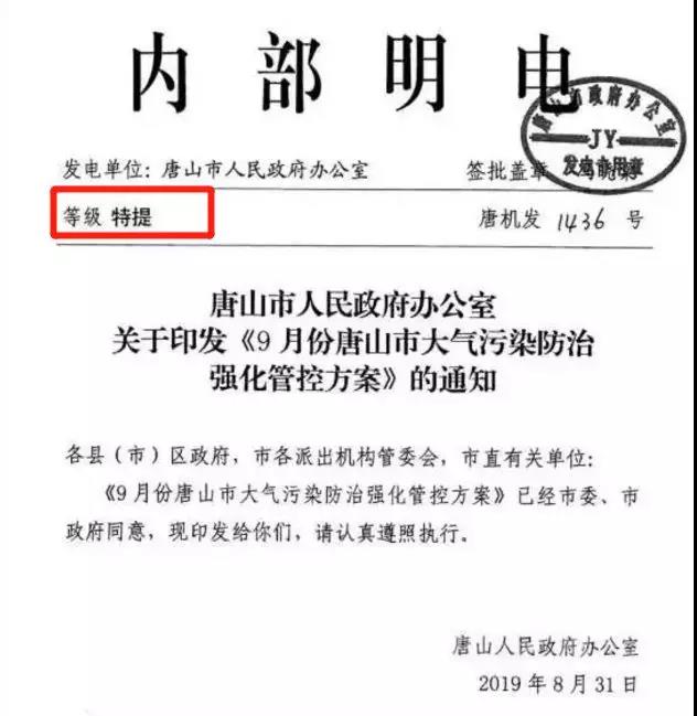 近日,唐山市人民政府發(fā)布《9月份唐山市大氣污染防治強化管控方案》的特提文件。該文件對于當(dāng)?shù)劁撹F、焦化、水泥、玻璃等工業(yè)企業(yè)的錯峰時間進行了明確的要求。而該文件與以往最大的區(qū)別,他是一份水泥行業(yè)非常少見的特提文件,那特提文件與其他文件的區(qū)別又是什么呢?據(jù)水泥人網(wǎng)了解, 為了確保公文的時效性,使緊急事項得以及時處理,對緊急公文必須注明緊急程度.,在公文中分別標(biāo)明”特提,特急,加急,平急” 從左到右緊急程度依次降低.,特提屬于最高級。“特提”文件需要馬上辦理,要求一天之內(nèi)辦完;而“特急”文件需在8小時內(nèi)閱辦,是要求三天之內(nèi)辦完;“加急”文件需在24小時內(nèi)閱辦,是要求五天之內(nèi)辦完。這足以看出此次停產(chǎn)的重要性和緊迫性?!?br />