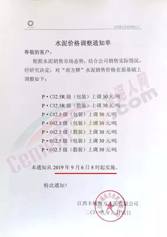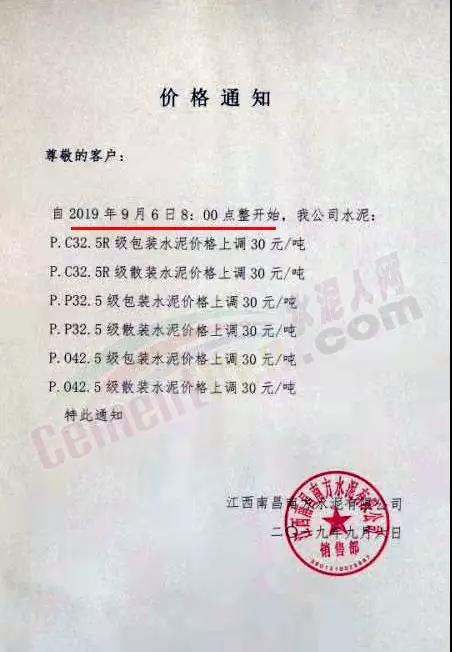 同期,分宜海螺水泥通知自9月7日8:00時,上調(diào)各品種水泥價格30元/噸;高安市相墾水泥有限公司銷售部發(fā)調(diào)價通知函稱自9月8日7時起,公司所生產(chǎn)的贛新、贛峰等各規(guī)格系列水泥在原價基礎(chǔ)上統(tǒng)一上調(diào)30元/噸。