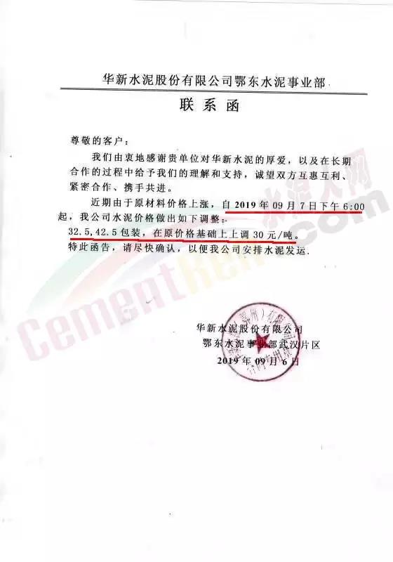 日前,華新水泥鄂東水泥事業(yè)部武漢片區(qū)發(fā)布聯(lián)系函稱,近期由于原材料價可靠上漲,自9月7下午6點起公司水泥價格32.5及42.5包裝在原價基礎(chǔ)上上調(diào)30元/噸。