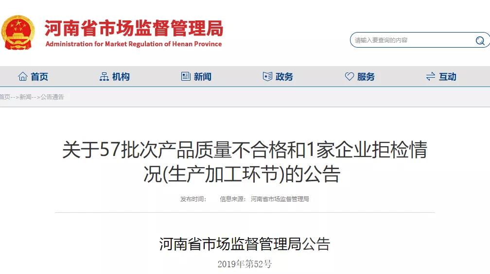 河南省市場(chǎng)監(jiān)督管理局發(fā)布2019年第52號(hào)公告,《關(guān)于57批次產(chǎn)品質(zhì)量不合格和1家企業(yè)拒檢情況(生產(chǎn)加工環(huán)節(jié))的公告 》。河南省市場(chǎng)監(jiān)督管理局發(fā)布2019年第52號(hào)公告詳情如下: