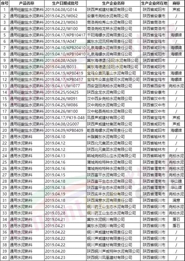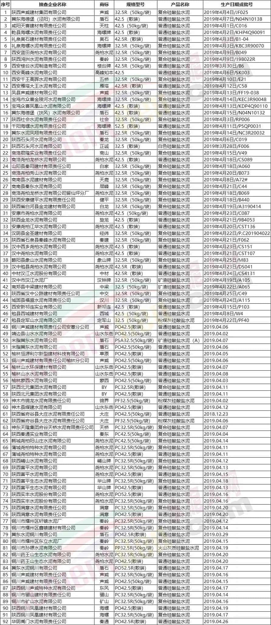 陜西省市場(chǎng)監(jiān)督管理局關(guān)于公布2019年第2季度 通用水泥熟料產(chǎn)品質(zhì)量監(jiān)督抽查結(jié)果顯示:樣品在西安、寶雞、咸陽(yáng)、銅川、渭南等地區(qū)的生產(chǎn)領(lǐng)域中抽取,共抽查生產(chǎn)企業(yè)30家,抽取樣品40批次,經(jīng)檢驗(yàn),合格樣品40批次,樣品合格率為100%。
