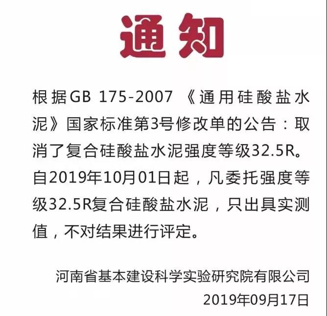 水泥人網(wǎng)通訊員消息:日前,河南省基本建設(shè)科技實(shí)驗(yàn)研究有限公司通知,根據(jù)GB 175-2007《通用硅酸鹽水泥》國(guó)家標(biāo)準(zhǔn)第3號(hào)修改單的公告,取消了復(fù)合硅酸鹽水泥強(qiáng)度等級(jí)32.45R,自2019年10月1日起,凡委托強(qiáng)度等級(jí)32.5R復(fù)合硅酸鹽水泥,只出具實(shí)測(cè)值,不對(duì)結(jié)果進(jìn)行評(píng)定。