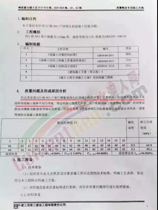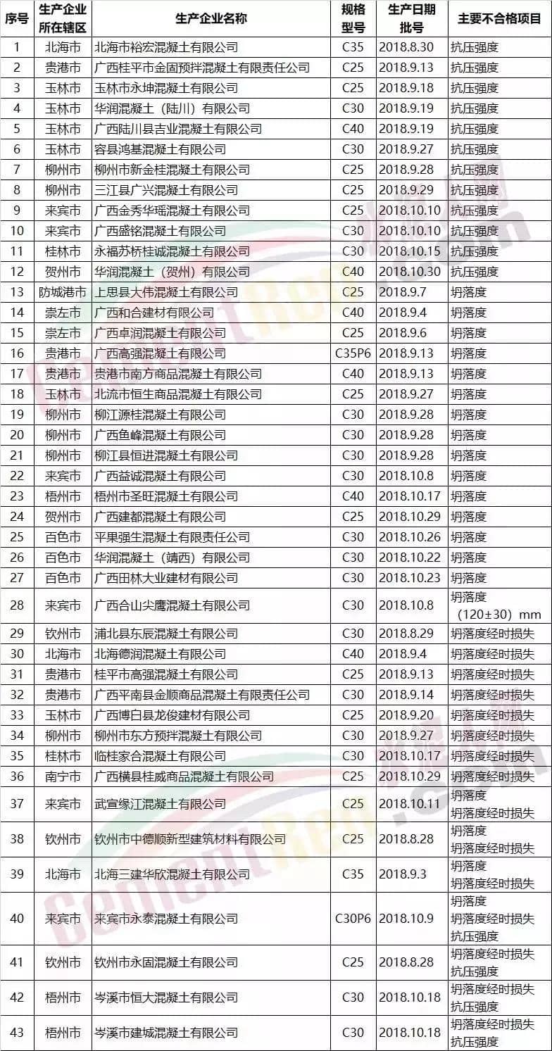 2018年7月,中康綠城百合花園項(xiàng)目部分樓房曾因質(zhì)量問(wèn)題被冠以“膠帶樓房”之名。記者多次探訪,并從多個(gè)信息源了解到,該項(xiàng)目2017年4月開(kāi)工建設(shè),但其中已接近封頂?shù)?號(hào)樓、14號(hào)樓、15號(hào)樓、16號(hào)樓,因混凝土強(qiáng)度不達(dá)標(biāo)導(dǎo)致部分樓層的樓板、墻壁等出現(xiàn)嚴(yán)重裂縫。這一情況被諸多業(yè)主無(wú)意中發(fā)現(xiàn)后,引發(fā)強(qiáng)烈不滿。2018年4月份,天津市城鄉(xiāng)建設(shè)委員會(huì)對(duì)粵翠名邸存在的質(zhì)量問(wèn)題進(jìn)行處理情況通報(bào),建設(shè)樓體的混凝土強(qiáng)度應(yīng)為C25,而施工時(shí)卻使用的是C15。導(dǎo)致結(jié)構(gòu)強(qiáng)度不夠,將會(huì)導(dǎo)致整體結(jié)構(gòu)強(qiáng)度不夠,帶來(lái)極大的安全隱患。天房集團(tuán)決定,將該項(xiàng)目已經(jīng)全部完成的18棟住宅主體建筑拆除重建。……混凝土強(qiáng)度不足,建筑物就存在安全隱患,使用壽命也會(huì)縮短,可能達(dá)不到設(shè)計(jì)要求年限就不能使用了,嚴(yán)重的會(huì)造成墻體倒塌甚至整棟樓倒塌。混凝土強(qiáng)度不符合設(shè)計(jì)要求,還會(huì)使建筑物的抗震級(jí)別及應(yīng)對(duì)其他極端情況的能力大打折扣。據(jù)某檢測(cè)機(jī)構(gòu)負(fù)責(zé)人介紹:混凝土最常見(jiàn)的不合格問(wèn)題就是抗壓強(qiáng)度不夠,而水泥最常見(jiàn)的質(zhì)量不合格是因?yàn)槁入x子超標(biāo)所致。水泥中氯離子超標(biāo)會(huì)產(chǎn)生電化學(xué)反應(yīng),使鋼筋表面的鐵不斷失去電子而溶于水從而被腐蝕。同時(shí)還會(huì)在鋼筋表面形成紅鐵銹,導(dǎo)致體積膨脹使混凝土結(jié)構(gòu)開(kāi)裂?;炷翉?qiáng)度不達(dá)標(biāo)使混凝土碳化深度增大,降低使用壽命,極大地影響建筑結(jié)構(gòu)的安全性和耐久性。據(jù)水泥人網(wǎng)了解,混凝土外加劑產(chǎn)品市場(chǎng)競(jìng)爭(zhēng)激烈,價(jià)格戰(zhàn)的結(jié)果就是濫用原材料、以次充好的現(xiàn)象時(shí)有發(fā)生,用戶過(guò)分追求低價(jià)格也助長(zhǎng)了這種現(xiàn)象的多發(fā)。外加劑的品種、配比不當(dāng):在防凍劑中,防凍劑數(shù)量不足;在泵送劑或緩凝減水劑中,緩凝劑的用量過(guò)大或羥基羧酸鹽緩凝劑未隨使用溫度的升降而增減;早強(qiáng)劑用量過(guò)大,配比不當(dāng)?shù)?,都?huì)造成混凝土強(qiáng)度下降。在混凝土拌制過(guò)程中外加劑超摻嚴(yán)重,會(huì)造成混凝土強(qiáng)度永久性不足。同樣,摻量少也會(huì)降低混凝土強(qiáng)度,特別是有減水功能的外加劑,如泵送劑、減水劑等,由于摻量的減少,往往會(huì)增加拌合水的用量,從而造成混凝土強(qiáng)度不足。近期被通報(bào)的部分混凝土企業(yè)產(chǎn)品抽檢不合格名單: