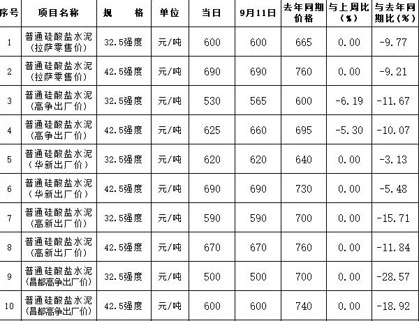 2019年第38周拉薩市水泥價格監(jiān)測表