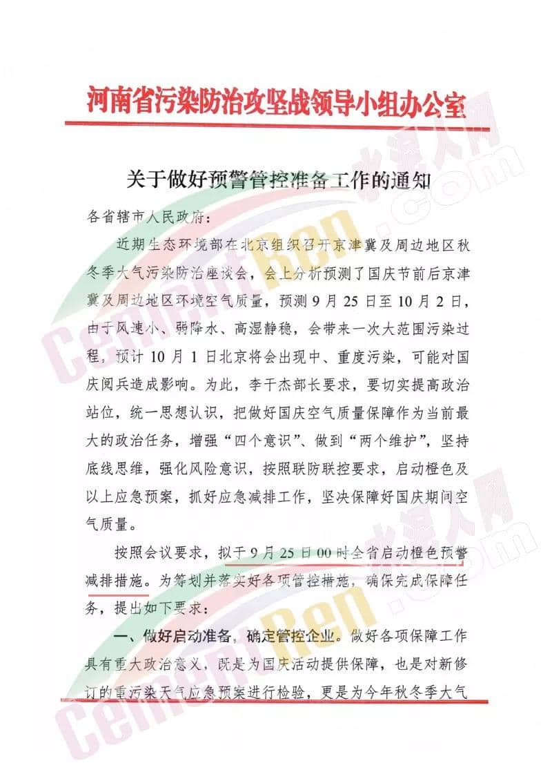 同期,河南省污染防治攻堅戰(zhàn)領(lǐng)導小組辦公室發(fā)布《關(guān)于做好預警管控準備工作的通知》稱,擬于9月25日0時全省啟動橙色預警減排措施。通知全文如下: