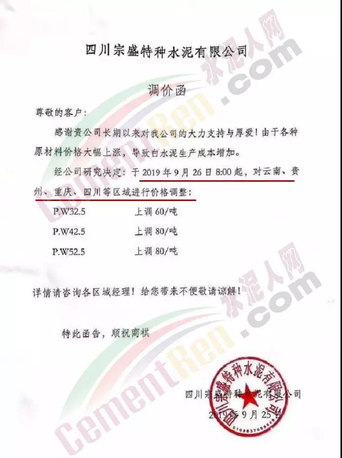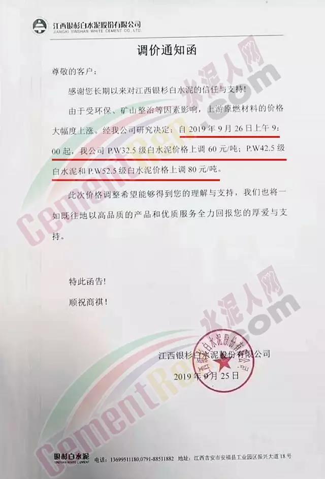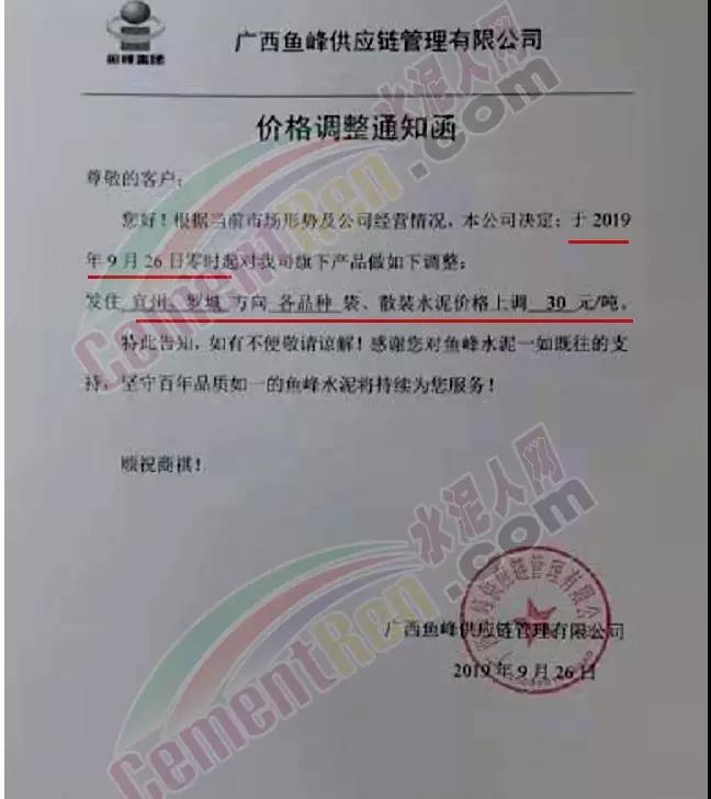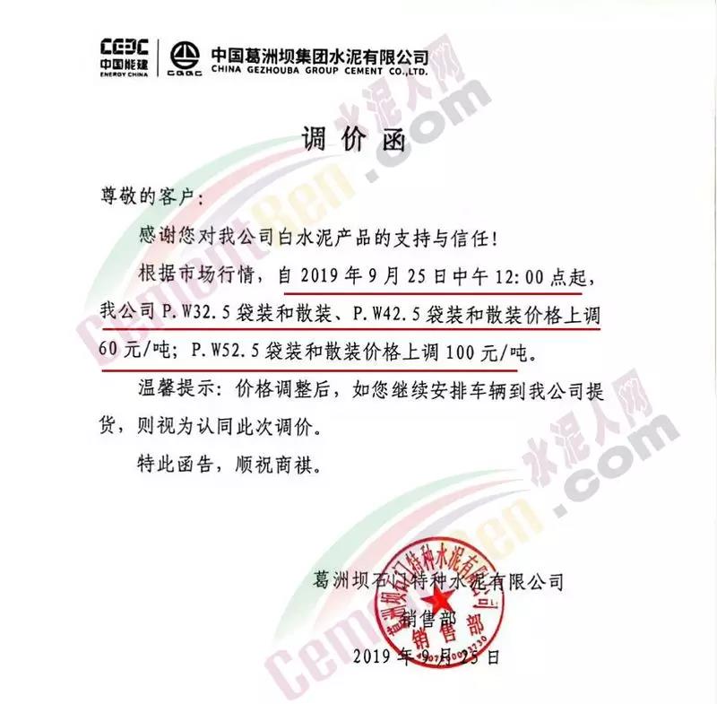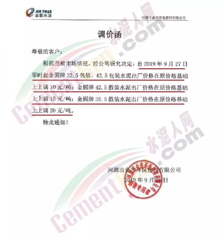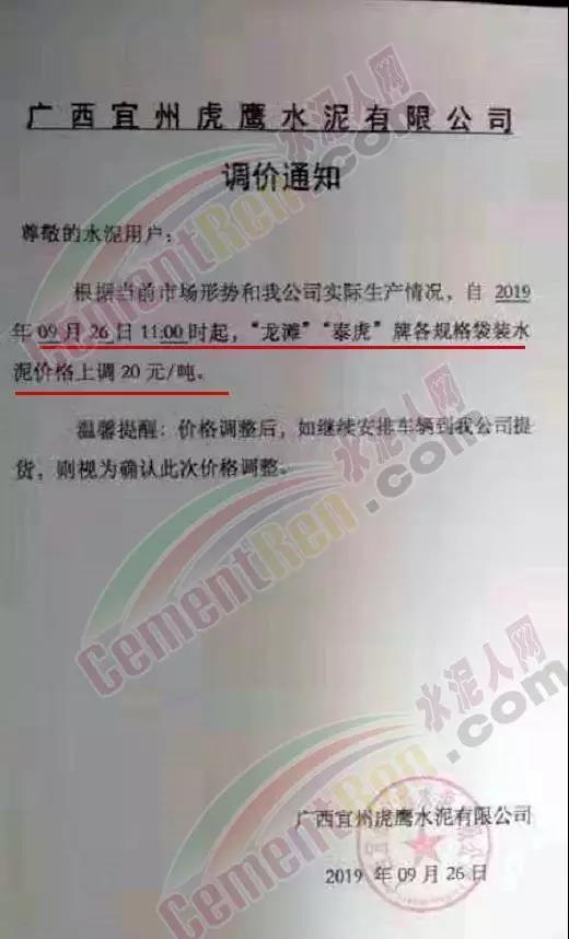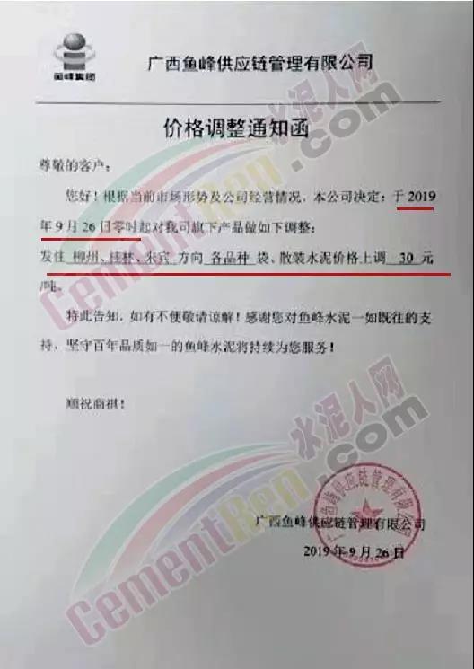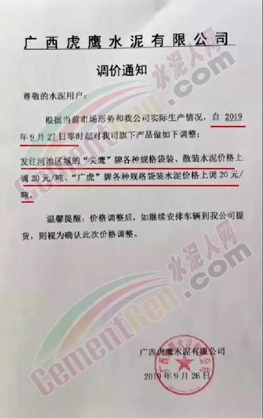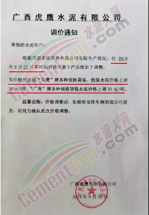 根據(jù)當(dāng)前市場(chǎng)形勢(shì)及我司生產(chǎn)情況,我公司決定于2019年9月26日8時(shí),上調(diào)所有品種袋裝、散裝水泥價(jià)格30元/噸。價(jià)格上調(diào)以我司出廠過(guò)磅時(shí)間為準(zhǔn),如您繼續(xù)安排提貨,則視為認(rèn)同此次價(jià)格調(diào)整。順祝商祺!