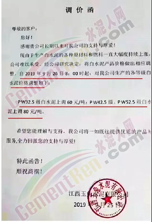 江西玉免水泥有限公司調(diào)價(jià)函稱(chēng),由于生產(chǎn)白水泥的各種原材料一直大幅持續(xù)上漲,公司難以承受。經(jīng)公司研究決定,將白水泥價(jià)格做出相應(yīng)調(diào)整。自9月26日早8時(shí)起,對(duì)公司生產(chǎn)的各等級(jí)白水泥價(jià)格進(jìn)行調(diào)整,上調(diào)幅度60-80元/噸。