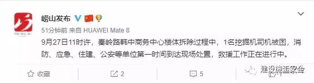 微博內(nèi)容截圖據(jù)嶗山發(fā)布官方微博發(fā)布消息稱,9月27日11時許,青島市嶗山區(qū)秦嶺路韓中商務(wù)中心樓體拆除過程中,1名挖掘機(jī)司機(jī)被困,消防、應(yīng)急、住建、公安等單位第一時間到達(dá)現(xiàn)場處置,救援工作正在進(jìn)行中。 據(jù)知情人透露,該項目的拆除工作是由和達(dá)集團(tuán)進(jìn)行施工,現(xiàn)場突發(fā)意外整個樓體瞬間崩塌,挖掘機(jī)被埋。事故現(xiàn)場正進(jìn)行多方救援
