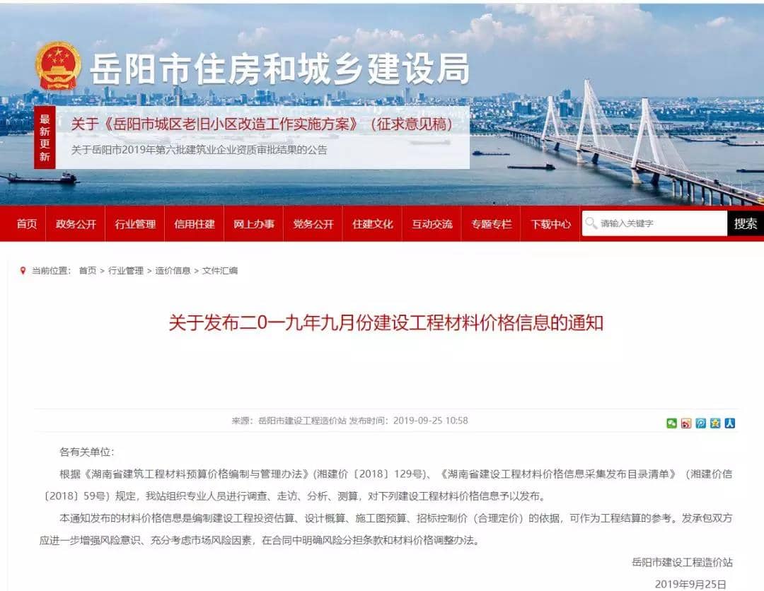岳陽市二0一九年九月份建設(shè)工程材料價(jià)格