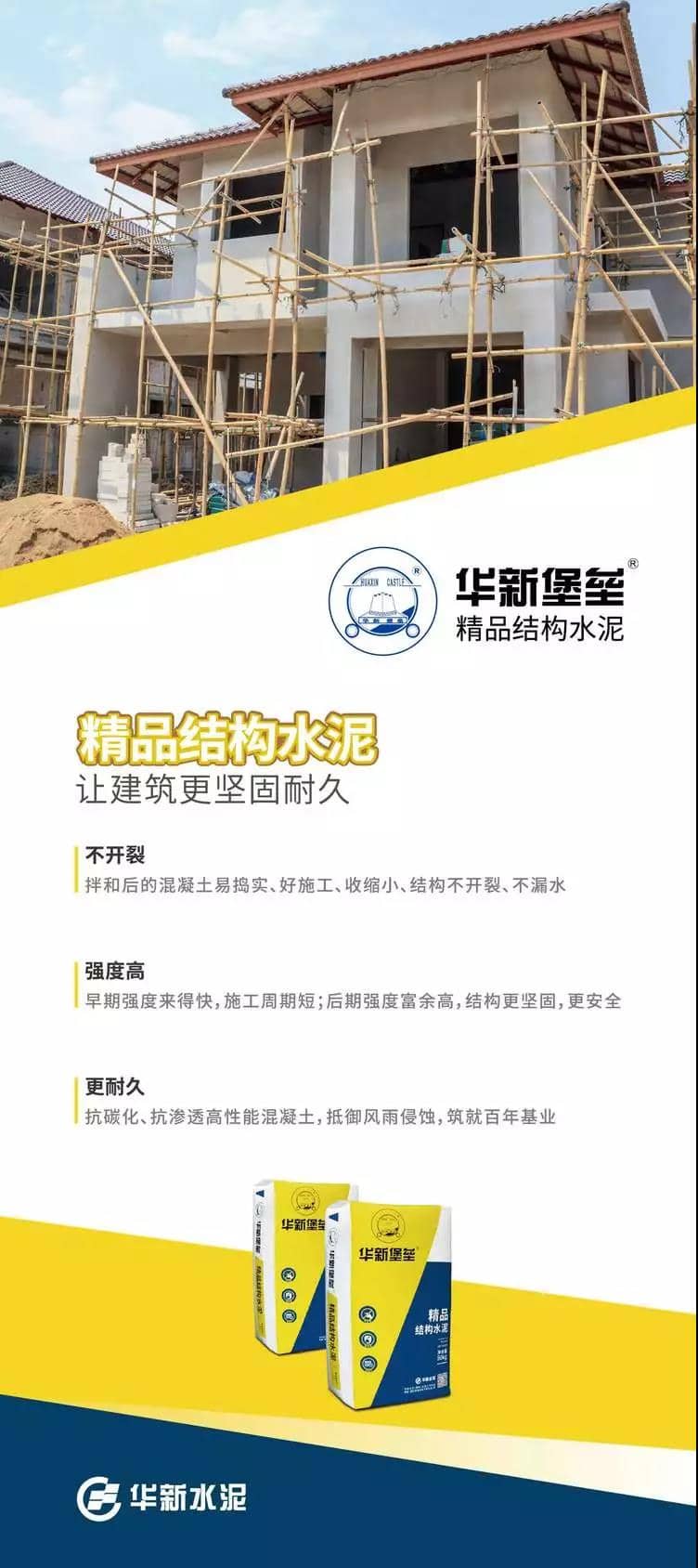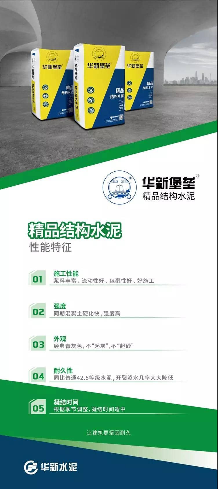 P·C42.5精品結(jié)構(gòu)水泥是華新水泥取消P·C32.5R水泥為契機(jī),通過(guò)公司專業(yè)研發(fā)團(tuán)隊(duì)在進(jìn)行了大量、充分的市場(chǎng)調(diào)研基礎(chǔ)上,針對(duì)私人建房、建筑結(jié)構(gòu)、基礎(chǔ)設(shè)施、一般工程、預(yù)制構(gòu)件、構(gòu)筑物等強(qiáng)度等級(jí)要求較高的混凝土工程施工需求在現(xiàn)有品類中分化出“結(jié)構(gòu)”水泥新品類。