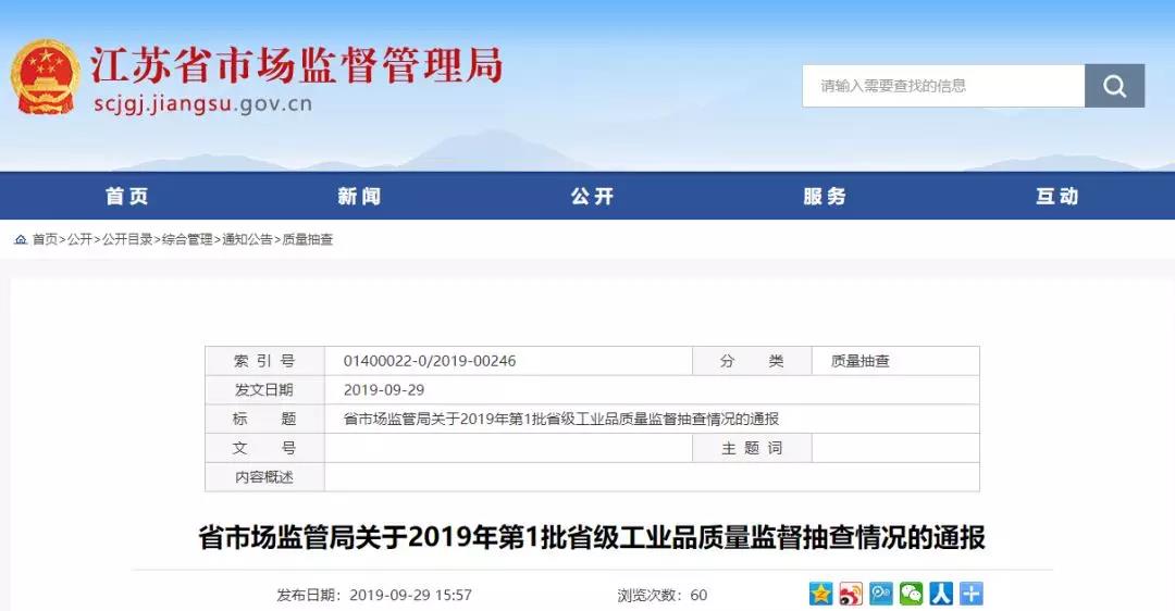 日前,江蘇省市場監(jiān)督管理局網(wǎng)站發(fā)布關(guān)于2019年第1批省級工業(yè)品質(zhì)量監(jiān)督抽查情況的通報。