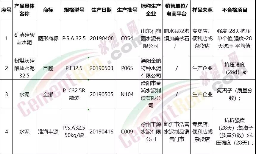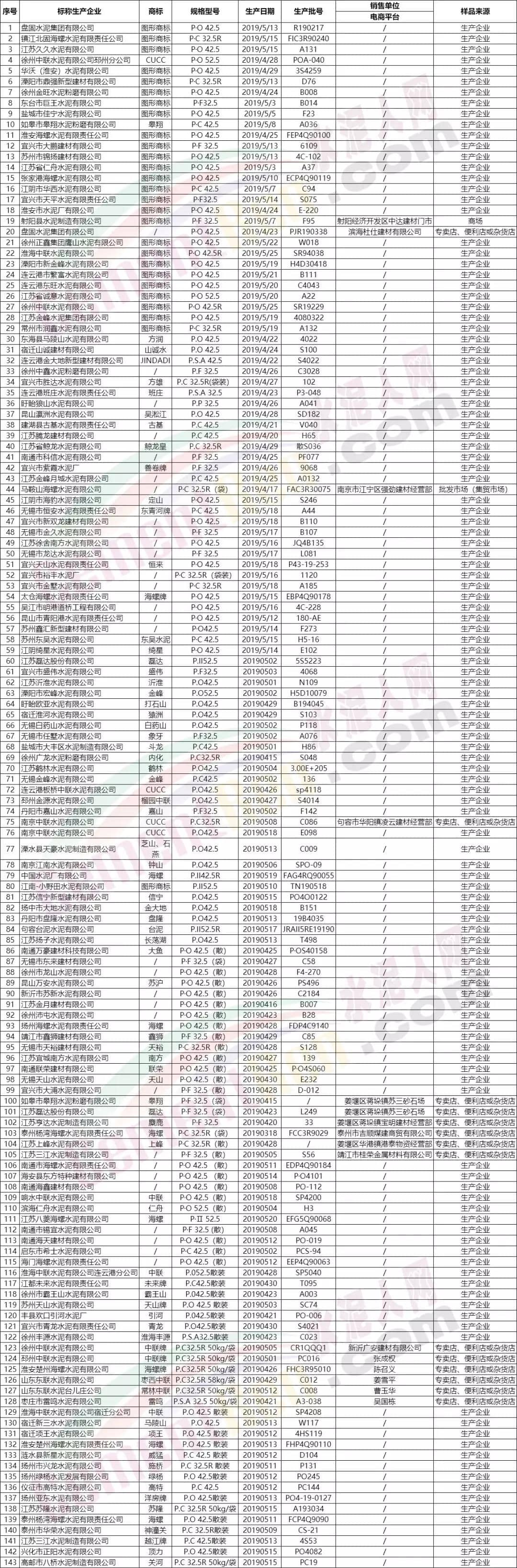 據(jù)通報,2019年第二季度,省市場監(jiān)管局組織對建筑和裝飾裝修材料、農(nóng)業(yè)生產(chǎn)資料、機(jī)械及安防產(chǎn)品等3大類29種產(chǎn)品質(zhì)量進(jìn)行了監(jiān)督抽查。共抽查產(chǎn)品2733批次,合格2481批次,平均合格率為90.8%。其中,在江蘇生產(chǎn)企業(yè)抽樣1162批次,合格1068批次,合格率為91.9%;在市場實體店購樣1317批次,合格1212批次,合格率為92%;在電商平臺購樣254批次,合格201批次,合格率為79.1%。建筑和裝飾裝修材料。抽查熱軋帶肋鋼筋、冷軋帶肋鋼筋、水泥、建筑防水涂料、建筑用鋼化玻璃、供水用塑料管材(PPR、PVC)、鋼筋混凝土排水管、鋁合金建筑型材、建筑保溫材料9種產(chǎn)品726批次,合格631批次,合格率為86.9%。其中,抽查產(chǎn)品150批次,合格146批次,合格率為97.3%。抽查不合格項目為強(qiáng)度、氯離子含量2項指標(biāo),有3批次產(chǎn)品的強(qiáng)度、2批次產(chǎn)品的氯離子含量項目不合格。不合格樣品的標(biāo)稱生產(chǎn)企業(yè)涉及山東石榴園水泥有限公司、溧陽金鵬特種水泥有限公司、溧陽市金瀨水泥制造有限公司、徐州豐源水泥有限公司。水泥抽檢不合格名單
