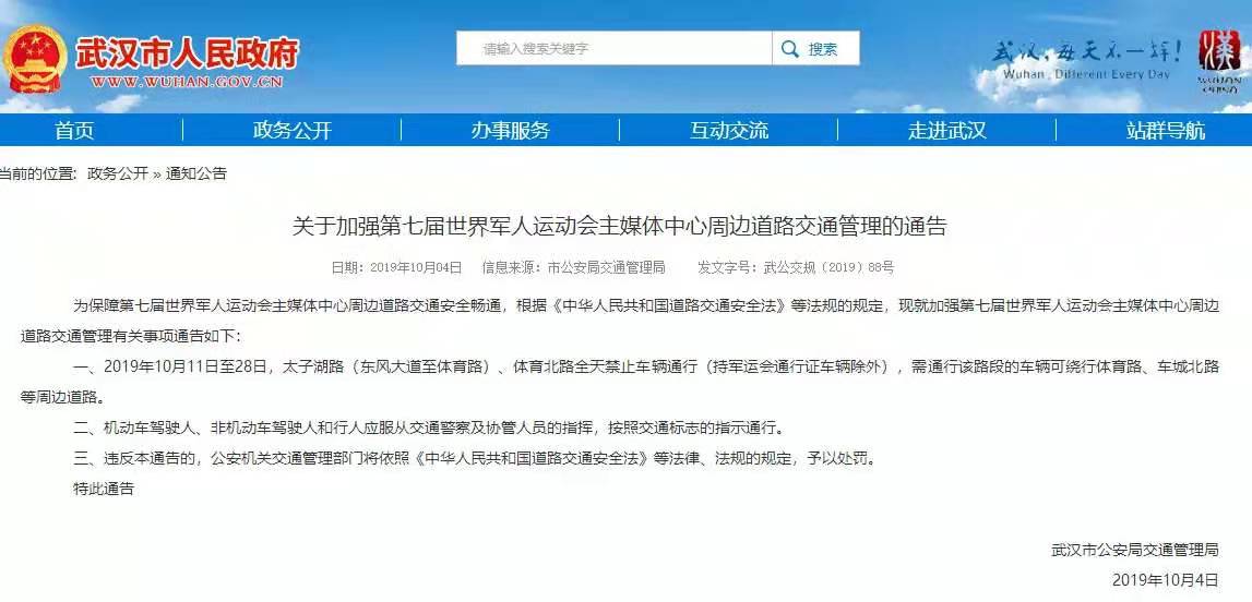 2019年10月8日武漢市政府常務(wù)會議,審議了高排放非道路移動機(jī)械、城市軌道交通運(yùn)營服務(wù)等工作。為了軍運(yùn)會的正常開展,發(fā)布了軍運(yùn)會期間交通管理措施:從10月15日0時起至10月28日24時,對貨車、?;愤\(yùn)輸車、外埠機(jī)動車通行區(qū)域和通行時間做出相應(yīng)限制。三環(huán)線區(qū)域內(nèi)(含三環(huán)線)以及道路,全天禁止載貨汽車通行。