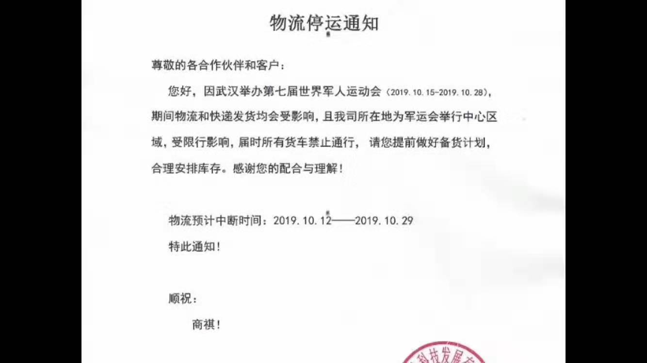 針對于軍運(yùn)會的舉行,期間物流和快遞均會受到影響,屆時所有貨車禁止通行,請?zhí)崆白龊脗湄浻媱?,合理安排庫存。物流預(yù)計中斷時間:2019年10月12日至2019年10月29日。