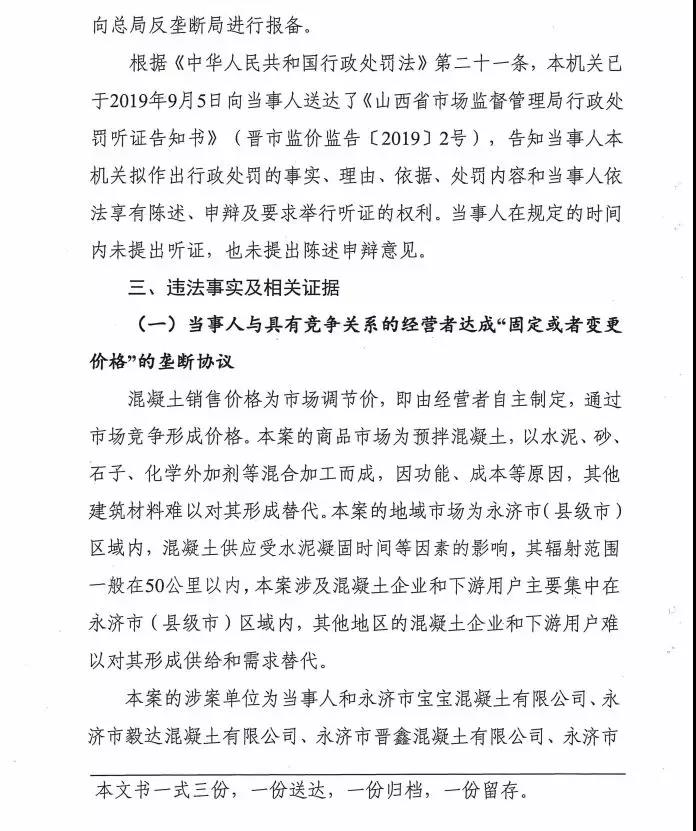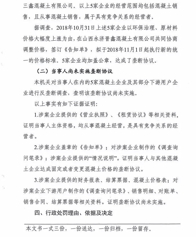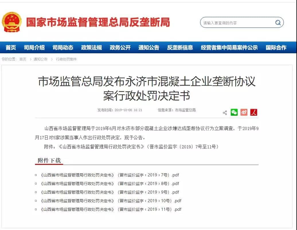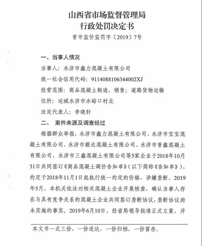 第7號(hào)處罰決定書提到根據(jù)群眾舉報(bào),永濟(jì)市鑫力混凝土有限公司、永濟(jì)市寶寶混凝土有限公司、永濟(jì)市毅達(dá)混凝土有限公司、永濟(jì)市晉鑫混凝土有限、永濟(jì)市三鑫混凝土有限公司等五家企業(yè)于上年10月31日共同簽訂《商品混凝土調(diào)價(jià)告知單》約定于當(dāng)年11月1日起執(zhí)行統(tǒng)一約定的價(jià)格,涉嫌壟斷。